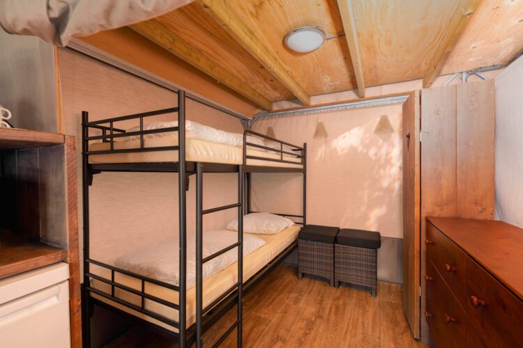 Deze accommodatie heeft een slaapkamer met 2 heerlijke boxspringbedden, een kinderslaapkamer met een stapelbed en een slaapzolder met 2 matrassen. Deze comfortabele bedden zijn inclusief dekbedden en hoofdkussens. De badkamer beschikt over een eigen douche, wastafel en toilet. De badkamer bevindt zich in de tent of achter de tent.