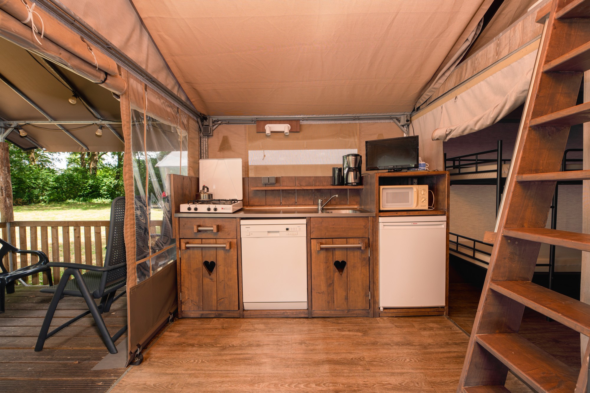 Deze accommodatie heeft een slaapkamer met 2 heerlijke boxspringbedden, een kinderslaapkamer met een stapelbed en een slaapzolder met 2 matrassen. Deze comfortabele bedden zijn inclusief dekbedden en hoofdkussens. De badkamer beschikt over een eigen douche, wastafel en toilet. De badkamer bevindt zich in de tent of achter de tent.